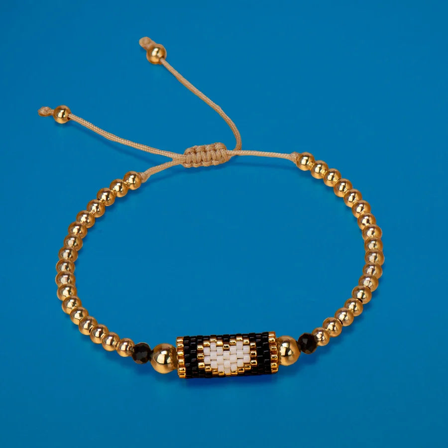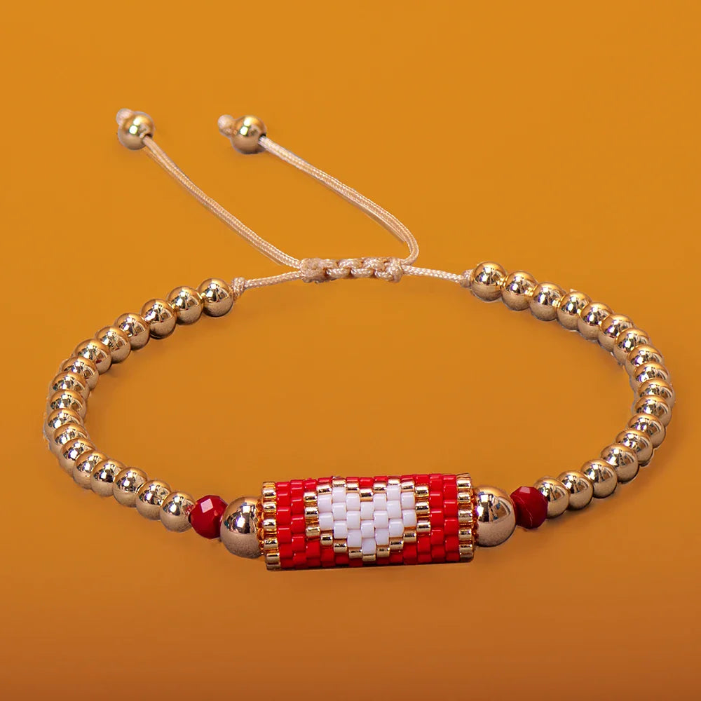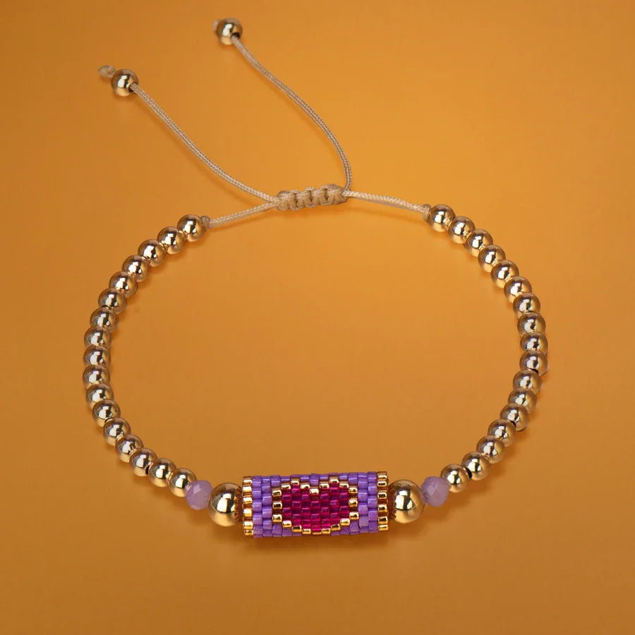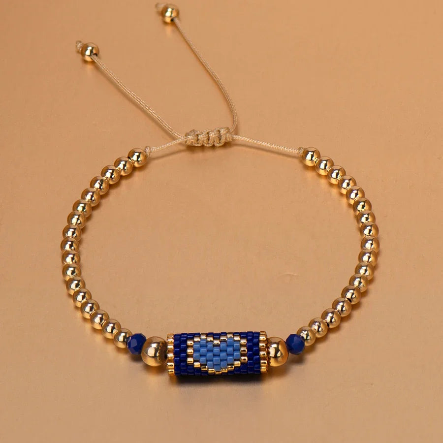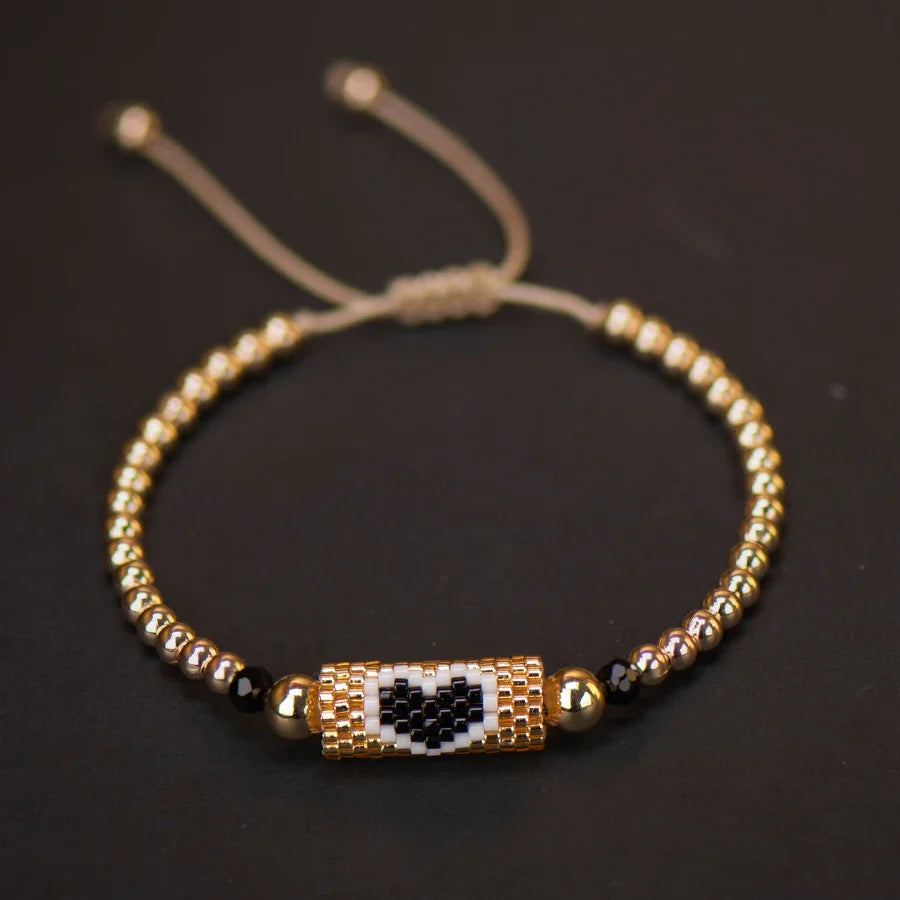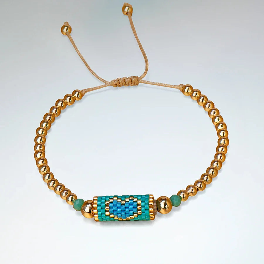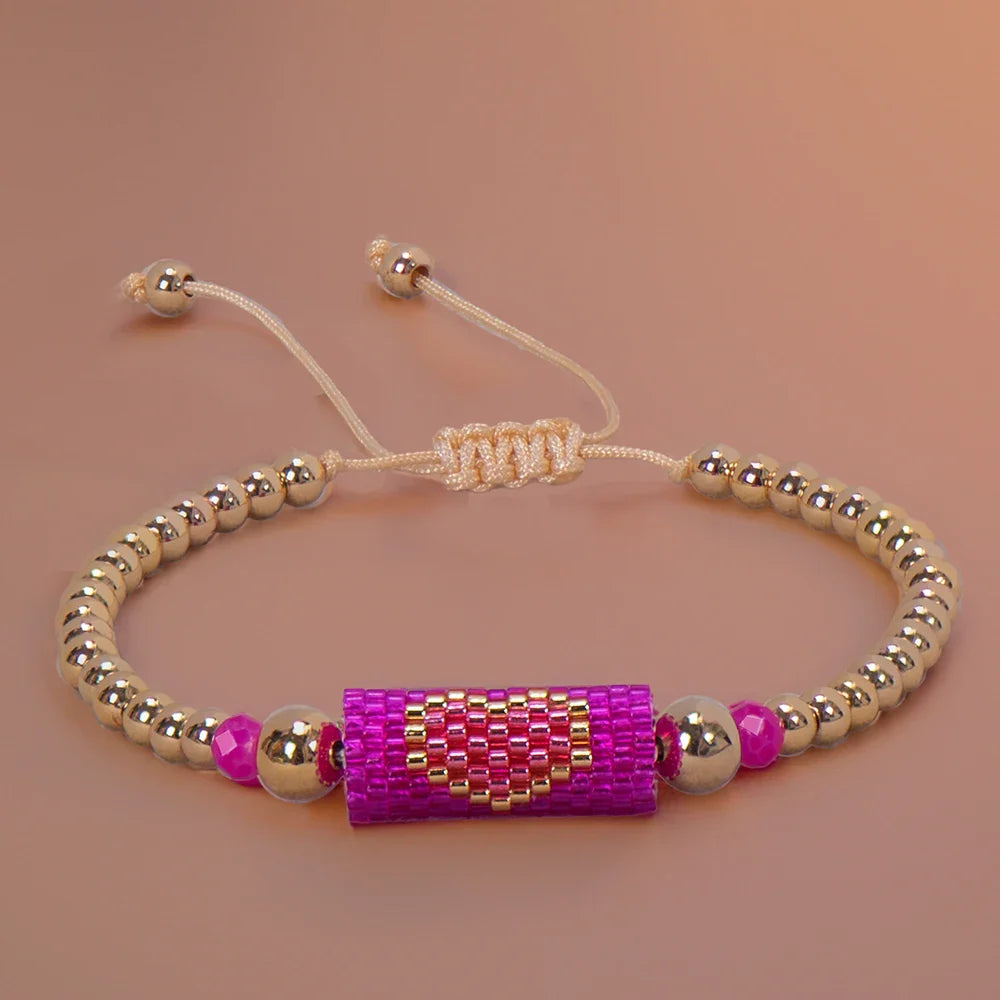 Indulge in the beauty of this handmade Heart Miyuki Bracelet, perfect for fashion lovers! With its adjustable woven design, it fits comfortably on any wrist. The hard golden plated beads add a touch of elegance, making it an ideal accessory for any summer outfit. Order yours today!