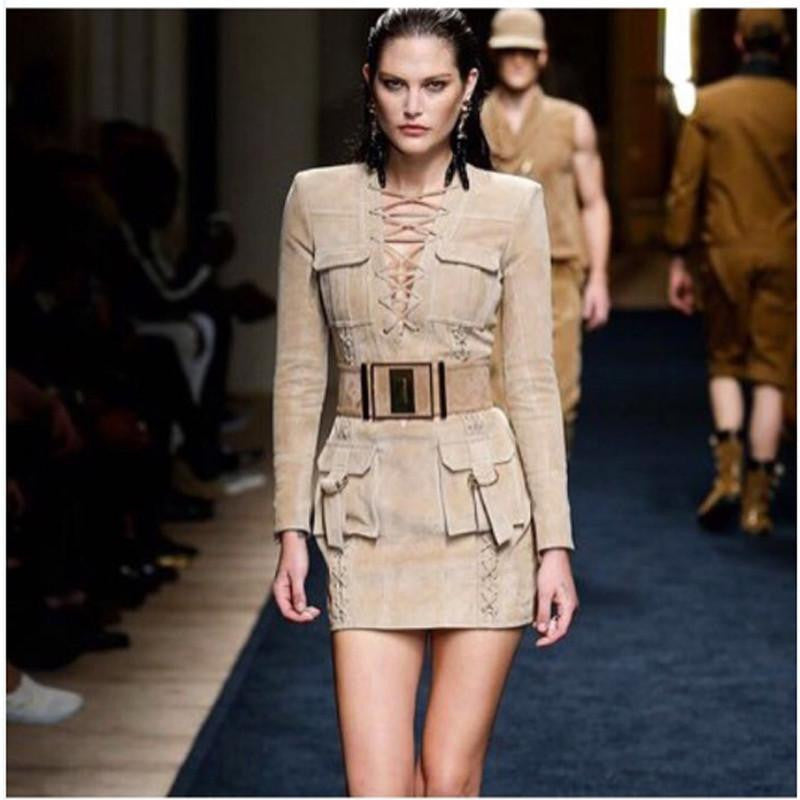 Introducing the Unique Runway Dress Women's Long Sleeve Deep V Lacing Vintage Faux Suede Dress, a stunning addition to your wardrobe that effortlessly combines elegance and style. Perfect for both casual outings and evening events, this dress is designed to make you feel confident and chic. The vintage-inspired design showcases a deep V neckline and intricate lacing, ensuring you stand out at any occasion.