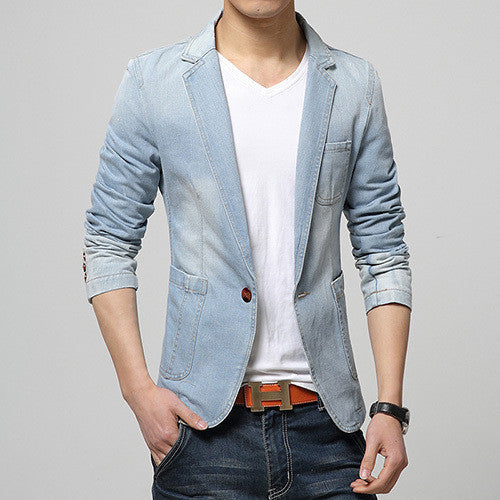 A stylish and comfortable, single button closure, regular clothing length, slim fit, long sleeve, cotton/denim men blazer/jacket.