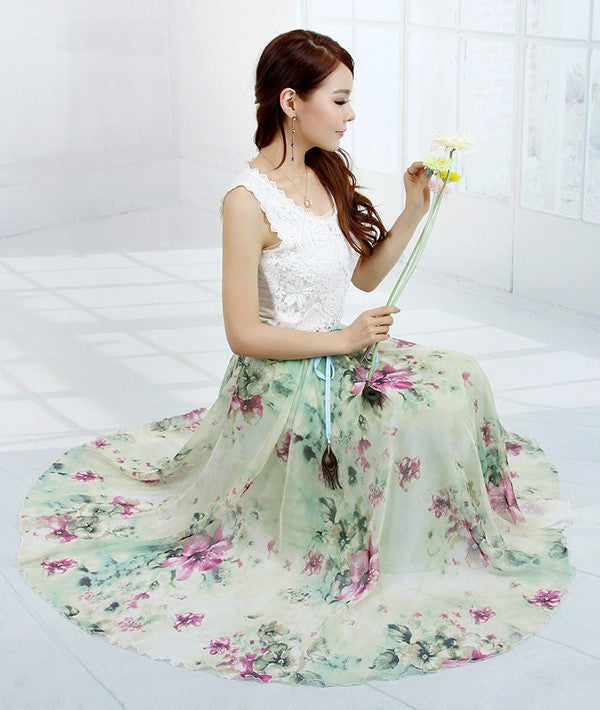 Embrace your fashion sense with this Elegant Fancy Flower Print Skirt Long Women Fashion Peacock Feather Elastic Waist Ultra-long Big Bottom Full Chiffon Skirt. Perfect for various occasions, it’s a must-have addition to your wardrobe. Experience the blend of elegance and comfort today!