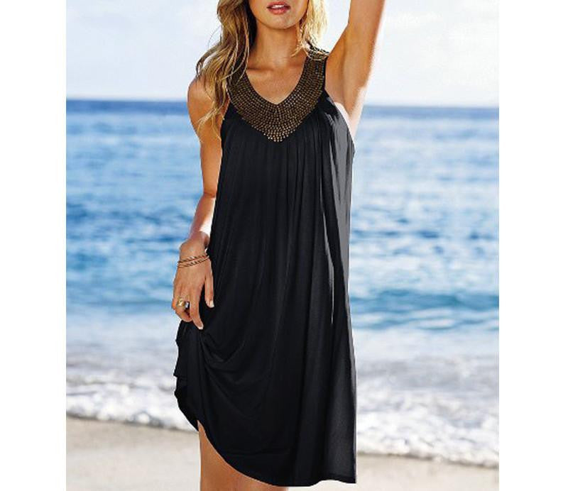 Start your tan this summer in this beautiful v-neck dress. This beautiful beach dress comes knee length and the sleeveless. This beautifully designed the peace will give you the attention you need.