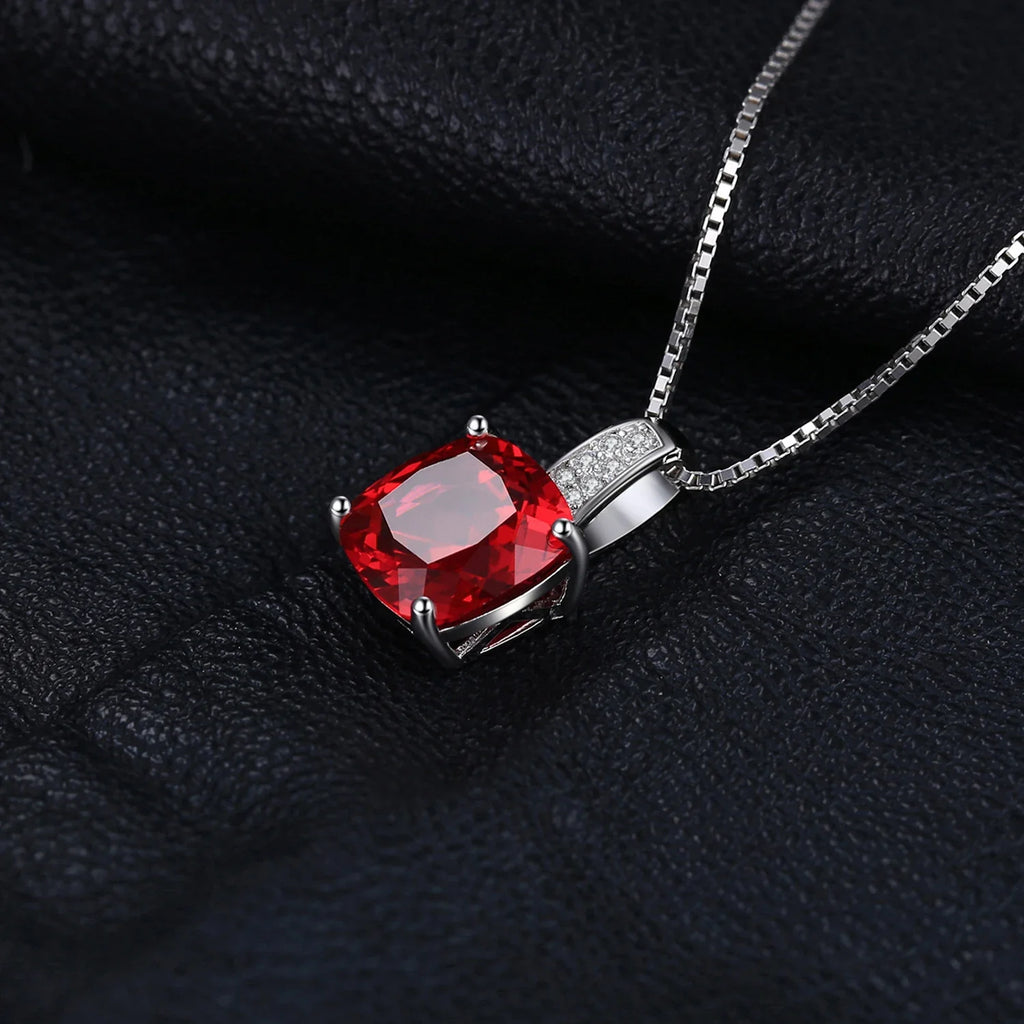 Indulge in luxury and elegance with our 4.7ct Created Red Ruby Pendant Necklace. Featuring a stunning cushion cut gemstone and crafted with 925 sterling silver, this necklace is the perfect choker gift for any woman. Elevate any outfit and make a bold statement with this exquisite necklace. (48 words)