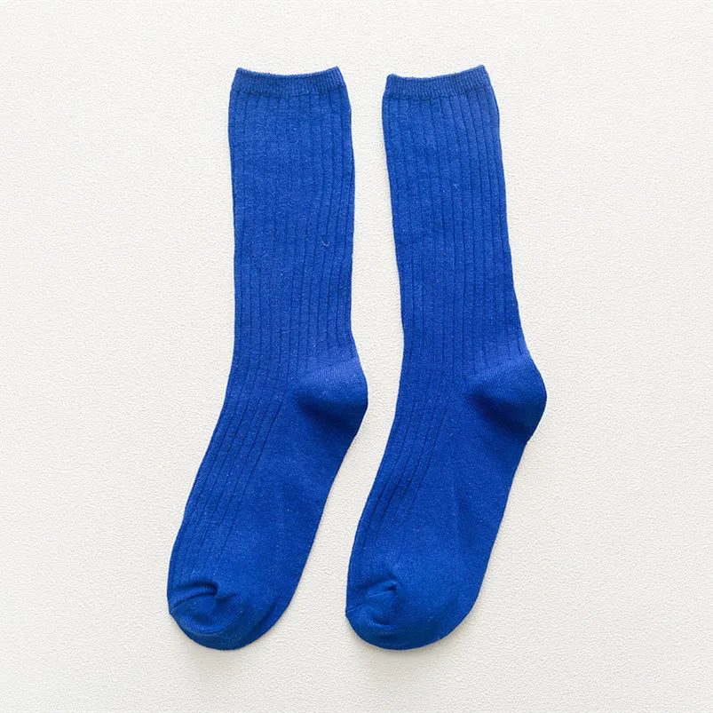 The solid color options available—Klein Blue, orange, yellow, green, beige, red, and black—allow you to mix and match with various outfits. Enjoy the retro charm and Korean fashion influence that these socks bring to your daily attire, making them a must-have for trendsetters.