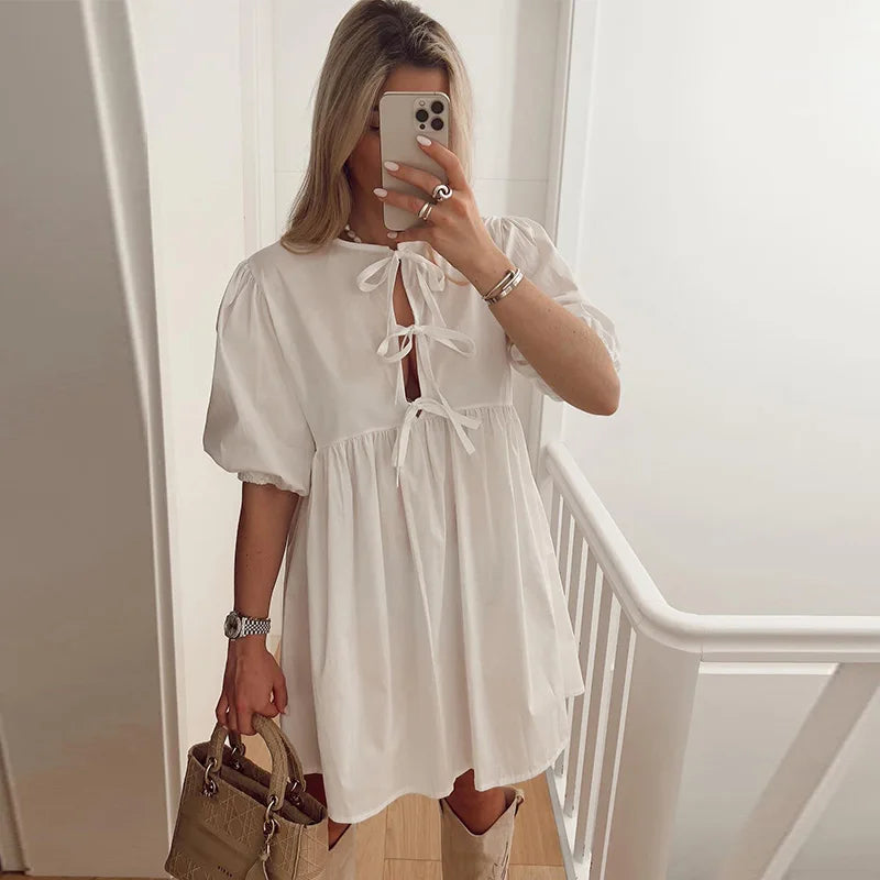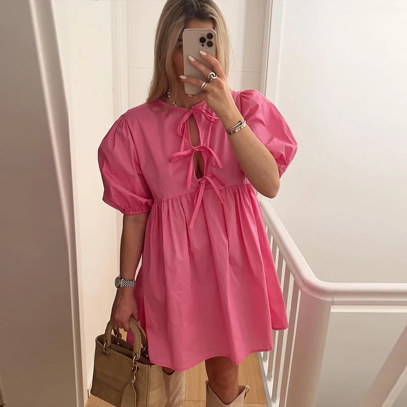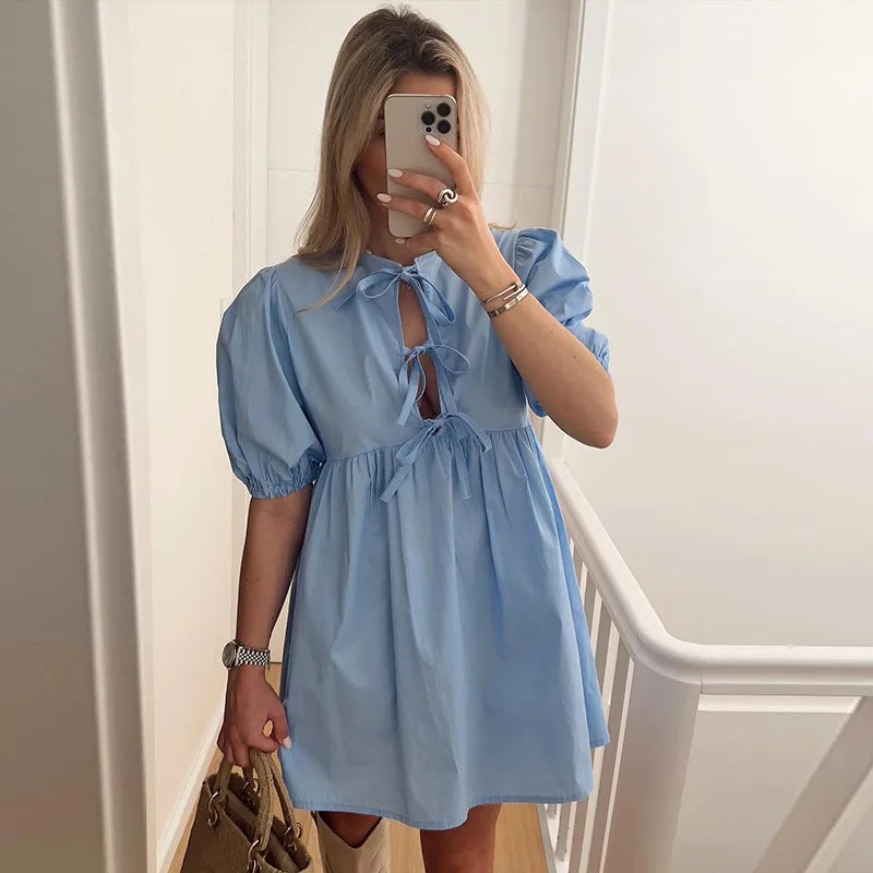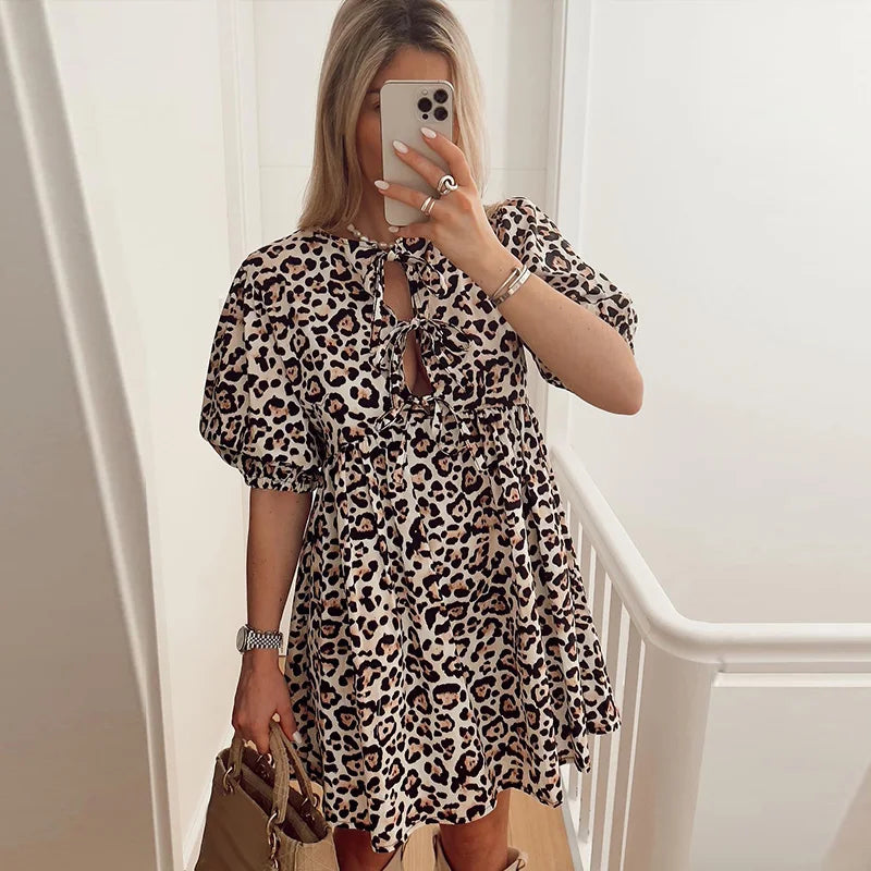 Dare to stand out in this fierce leopard print bow lace-up mini dress! The O-neck and hollow out design add a touch of edginess, while the short puff sleeves and A-line silhouette exude femininity. Perfect for summer and guaranteed to make a statement. Take a walk on the wild side with this daring dress!