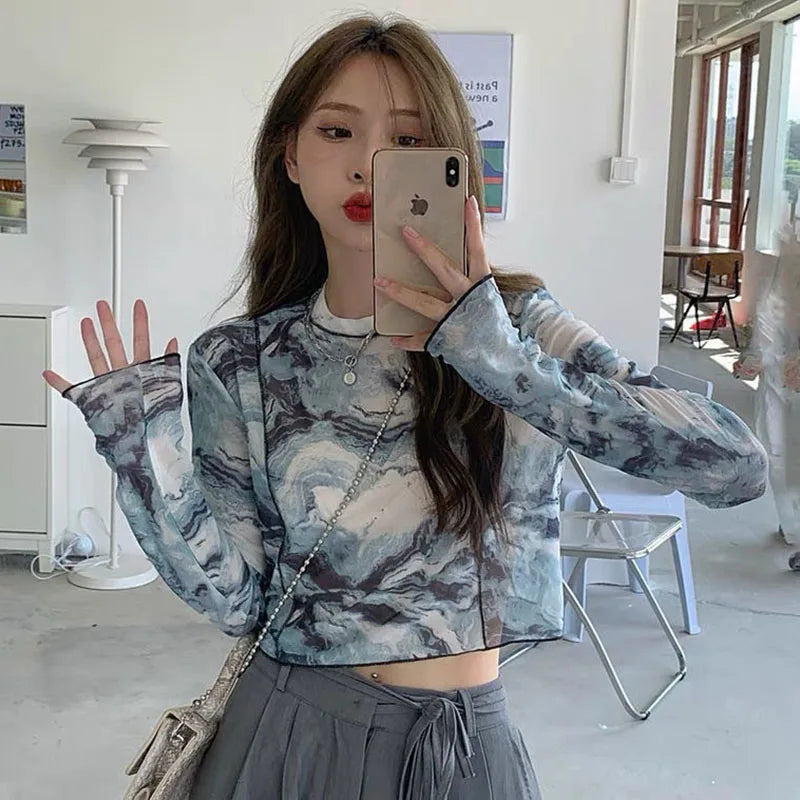 Elevate your summer wardrobe with our Long Sleeve T-shirts Women Tie-dye Printed Summer Sun-proof Cropped Tops Fashion High Street Gauze Korean Style Chic Teens Retro. This stunning piece is designed to keep you stylish and cool during the warm months. Featuring a vibrant tie-dye print, this cropped top exudes a trendy retro vibe, perfect for the fashion-savvy individual seeking to make a statement.