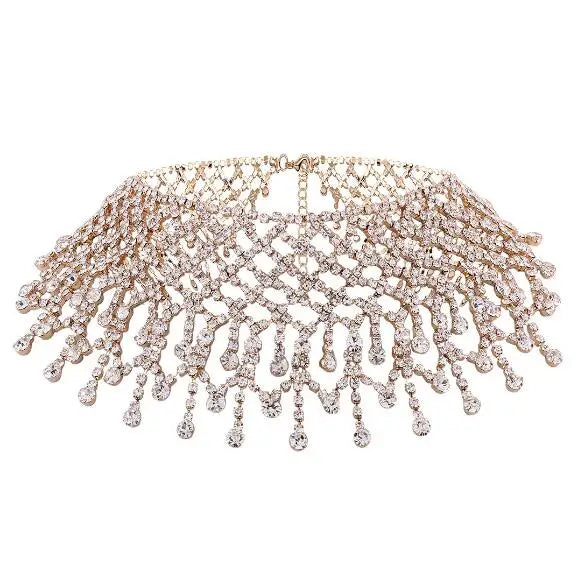 Complete your glamorous look with our luxury Rhinestone Chain Choker Necklace. The elegant full crystal tassel design adds a touch of sophistication to any outfit. Perfect for special occasions or dressing up everyday outfits. Elevate your style with this fashion-forward piece of bridal jewelry.