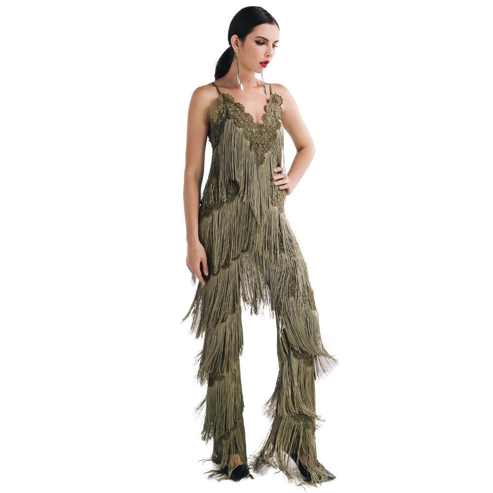 Introducing our stunning sleeveless V-NECK halter lace tassel jumpsuits, the ultimate fashion statement for the modern woman. This eye-catching piece combines comfort and elegance, making it perfect for any occasion, from casual outings to elegant events. Designed to enhance your silhouette, this jumpsuit features intricate lace detailing and playful tassels that add a touch of whimsy to your wardrobe.