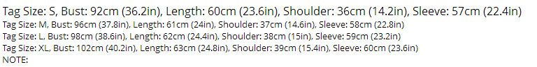 Bust: 92cm (36.2in), Length: 60cm (23.6in), Shoulder: 36cm (14.2in), Sleeve: 57cm (22.4in)