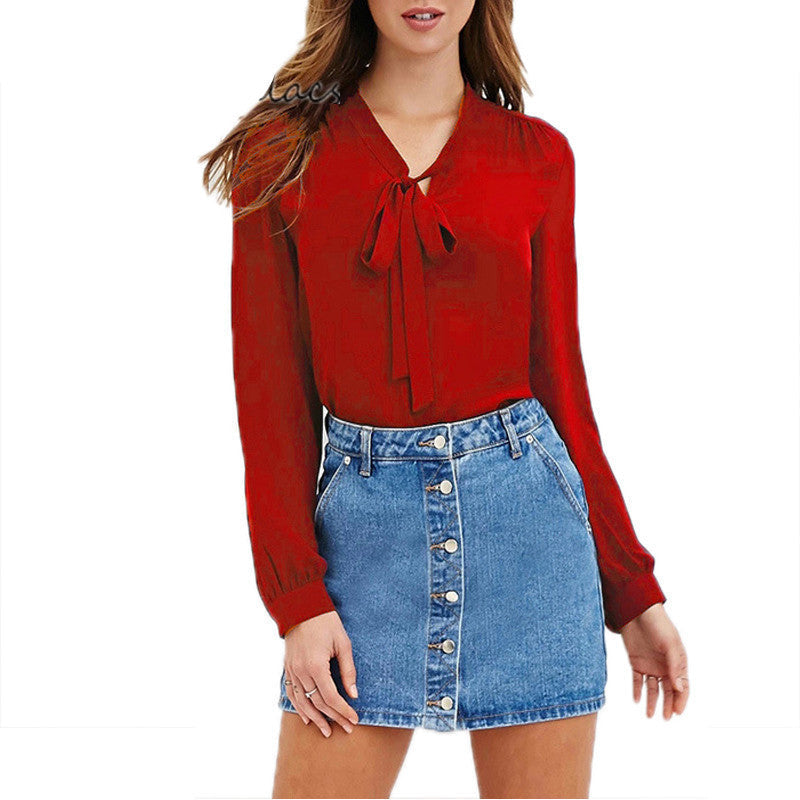 Elevate your wardrobe with our Women Fashion Casual Blouses Shirts Full Sleeve Bow Solid V-Neck Blouse. This stylish blouse is designed for women who appreciate a blend of comfort and elegance. Made from high-quality polyester, it offers a soft feel against the skin while ensuring durability. Its solid color pattern makes it versatile, allowing you to pair it effortlessly with jeans, skirts, or shorts for any occasion.