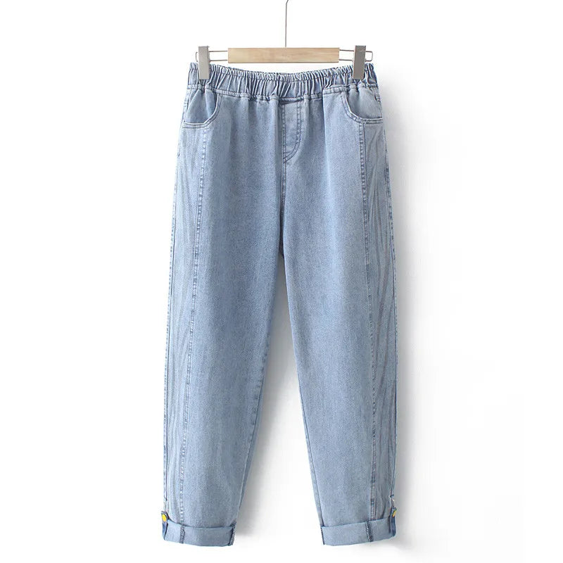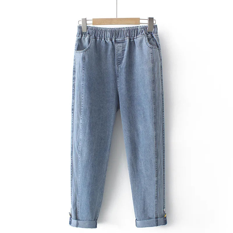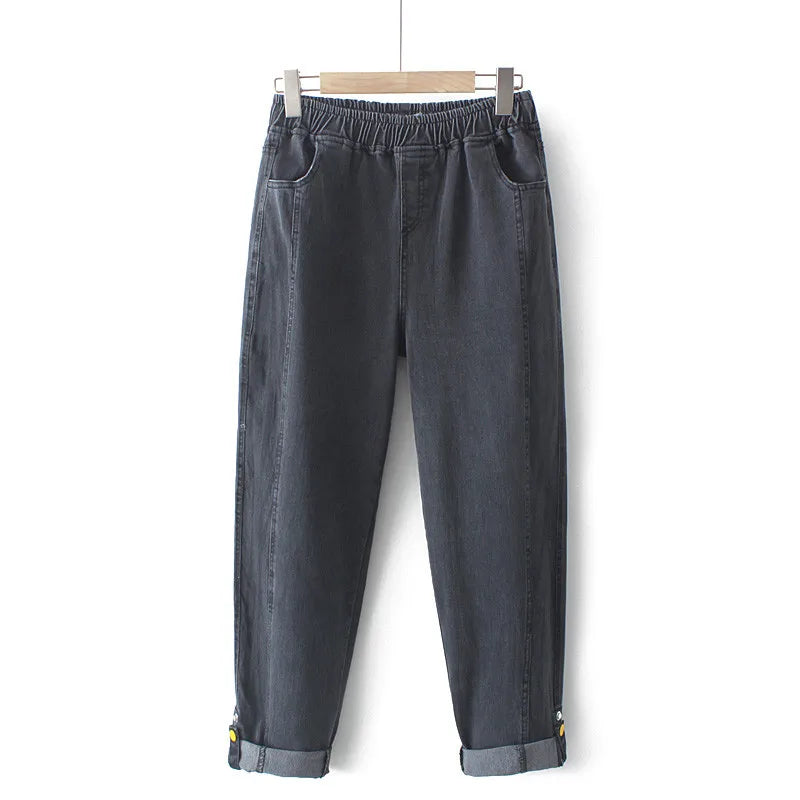 Discover the ultimate comfort and style with our Plus Size Women's Jeans Elastic High Waist Stretch Spring Summer Stretch Denim Jeans Button And Fold-Over Bottom Thin Pants 4XL. These jeans are designed for the modern woman who values both fashion and comfort, making them a perfect addition to your wardrobe this season. Featuring a high waist that flatters your figure, these jeans provide a secure fit while allowing for flexibility with their elastic fabric.