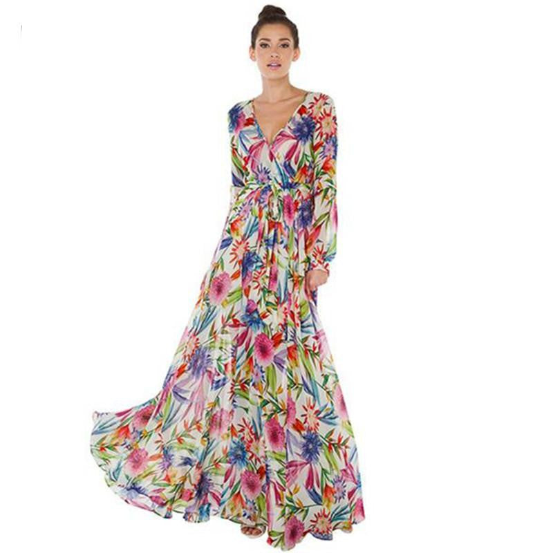 Step into the season with our exquisite Tropical Floral Print Floor-Length Bohemian Dresses V Neck Slim Lantern Sleeve Beach Dress. This stunning dress elegantly combines comfort with style, making it the ideal choice for both casual outings and special evening events. Crafted from a blend of lightweight polyester, rayon, and chiffon, this dress promises to keep you feeling cool and confident all summer long.