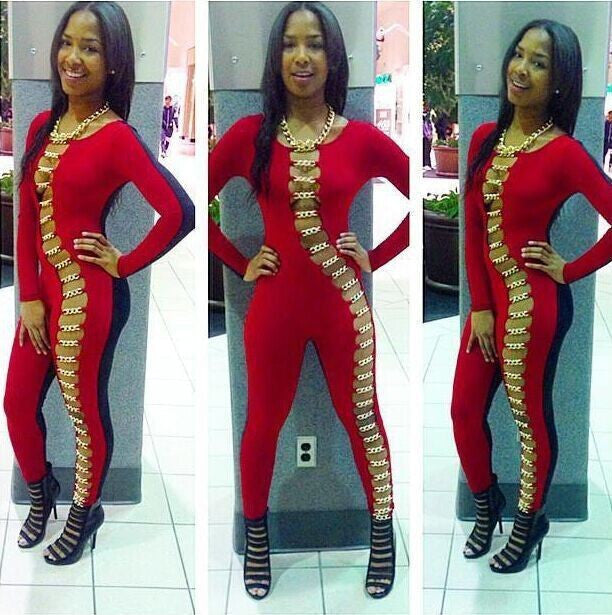 A lovely and sexy looking, hollow out, full length, solid pattern, skinny fit, chain cross, cotton and spandex bodycon jumpsuit and rompers.
