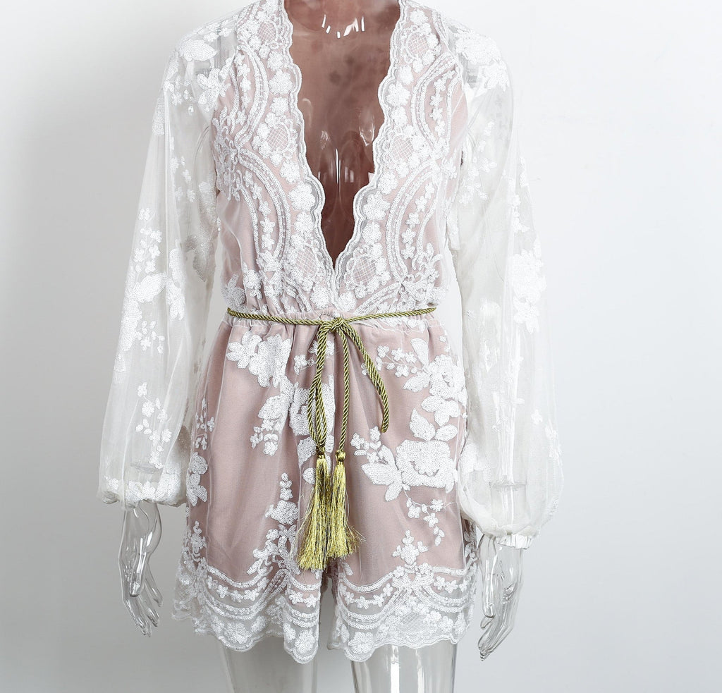 Sexy, transparent mesh, long sleeved, floral pattern, knitted women jumpsuit with sashes, tassel and embroidery as drations.