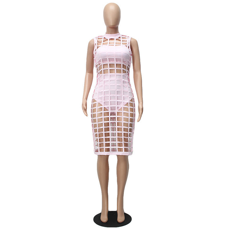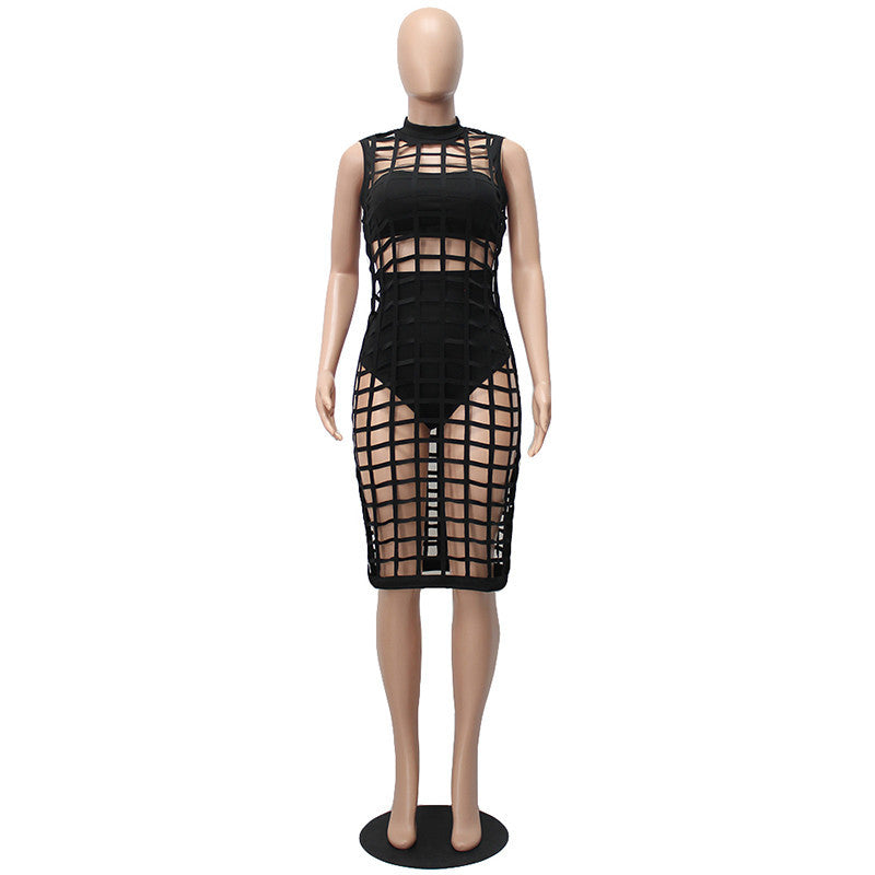 Three-piece set of black bandage figure revealing plaid hollow out vintage dress for women when choosing an outfit for party.