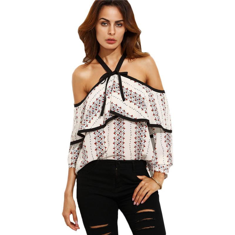 Discover the perfect addition to your wardrobe with our Womens Blouses Multicolor Print Halter Cold Shoulder Bow Long Sleeve Casual Blouse. This stunning blouse combines elegance with comfort, making it an ideal choice for any occasion. Designed for the modern woman, this fashionable piece features a unique multicolor print that will surely turn heads wherever you go.
