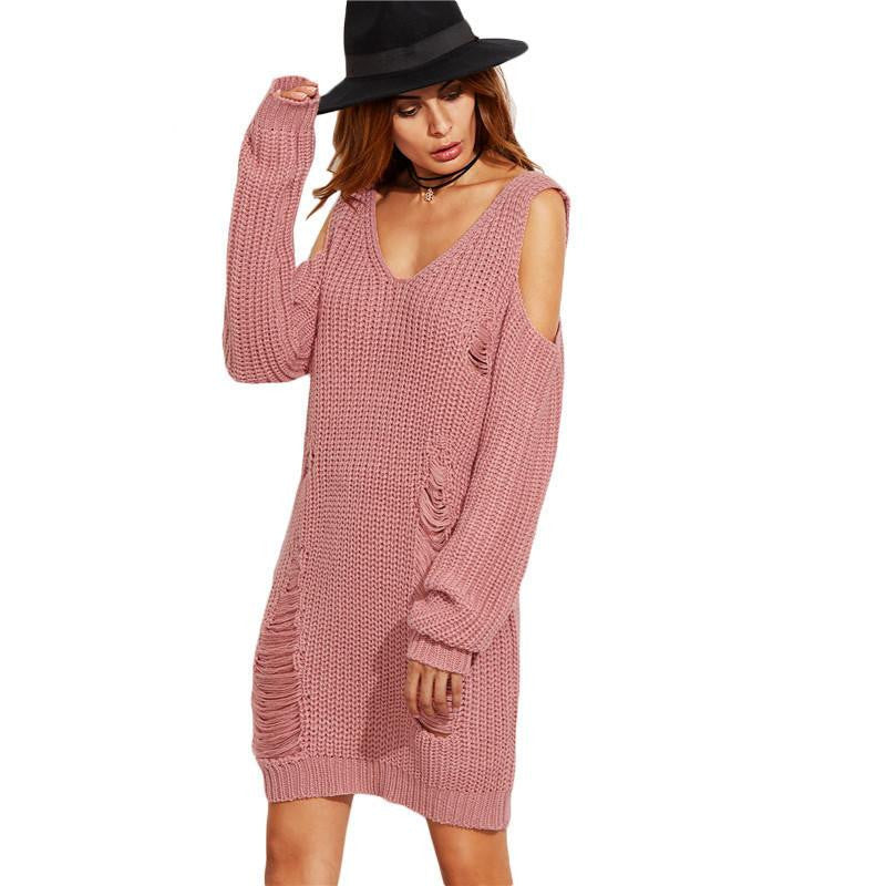 Don’t miss out on adding this fashionable and functional dress to your collection. Order your Womens Casual Shift Dresses Autumn Ladies Pink V Neck Cold Shoulder Long Sleeve Cut Out Ripped Sweater Dress today and step out in style this autumn!