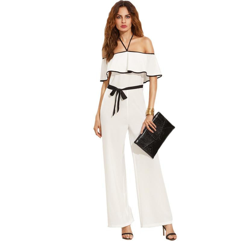 Elevate your fashion game with the Womens Romper Jumpsuit Black and White Halter Neck Short Sleeve Ruffle Tie Waist Elegant Jumpsuit. Embrace the perfect blend of style and comfort that will turn heads wherever you go!