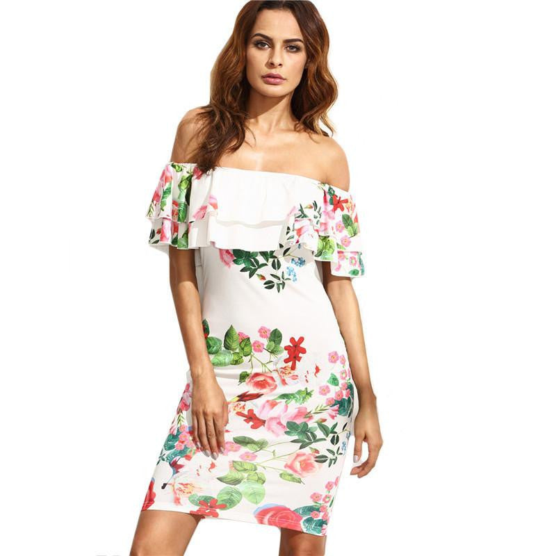 This mini dress is above the knee, featuring a flattering slash neck and half sleeves that provide just the right amount of coverage. Available in a range of sizes, you can find your perfect fit with ease. The natural waistline and hollow-out decoration add an extra element of charm. Choose the Summer Ladies Multicolor Floral Print Ruffle Off The Shoulder Sheath Half Sleeve Mini Dress to elevate your summer style today!