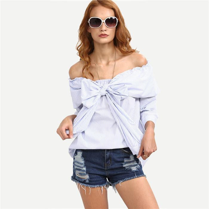 Step out with confidence in the Women Cute Tops Blue Striped Bow Off The Shoulder Blouses Style Casual Shirts Ladies 3/4 Sleeve Blouse. Don't miss out on this perfect blend of fashion and functionality—add it to your cart today!