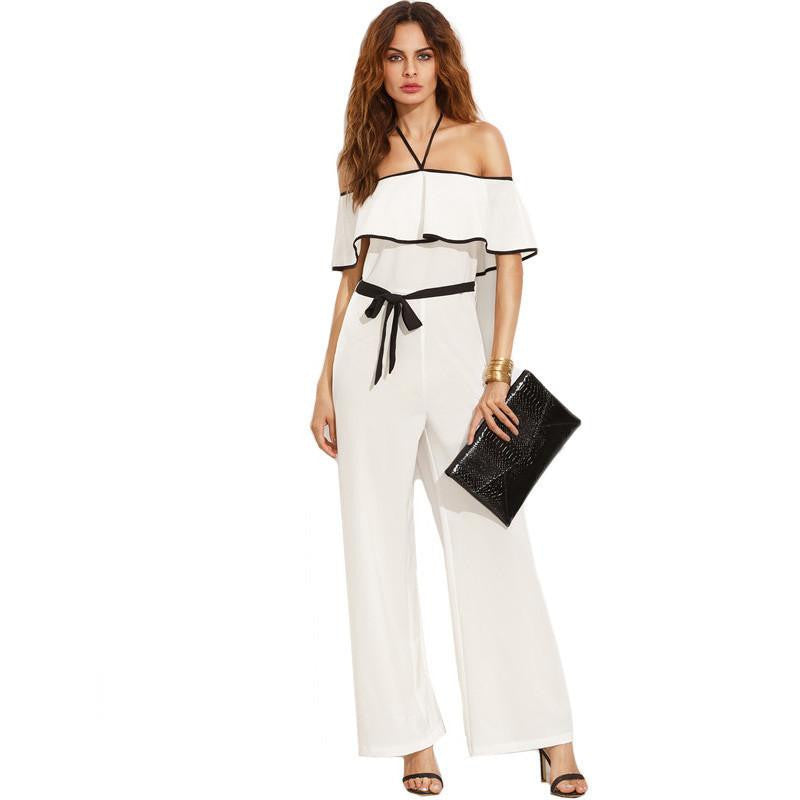 The Women's Vogue Black and White Patchwork Halter Ruffle Tie Waist Short Sleeve Elegant Long Jumpsuit is not just a jumpsuit; it's a statement piece that embodies sophistication and style. Add this versatile outfit to your collection and step out with confidence!