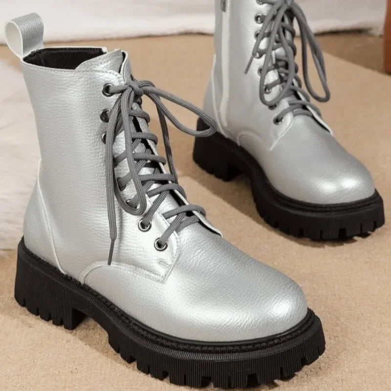 These Shoes Women Silver Women's Boots Anti-slip and Wear-resistant Ladies High-top Motorcycle Boots are versatile enough to pair with jeans for a casual look or with a stylish dress for a night out. The cross-tied fashion element adds a contemporary touch, making them suitable for various seasons, especially winter. With a fit that is true to size, you can confidently order your normal size and step out in style.