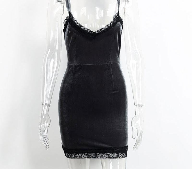 Get this gorgeous velvet mini dress with lace trimmings and spaghetti straps. This piece is sexy and very stylish.