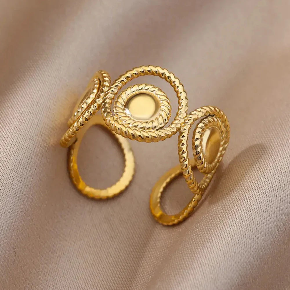 Take the risk and make a statement with our Stainless Steel Rings! This gold-colored, hollow, wide-open ring is perfect for both men and women. Its unique design is sure to catch the eye, making it great for any occasion, from engagement to wedding and beyond. Dare to be bold!