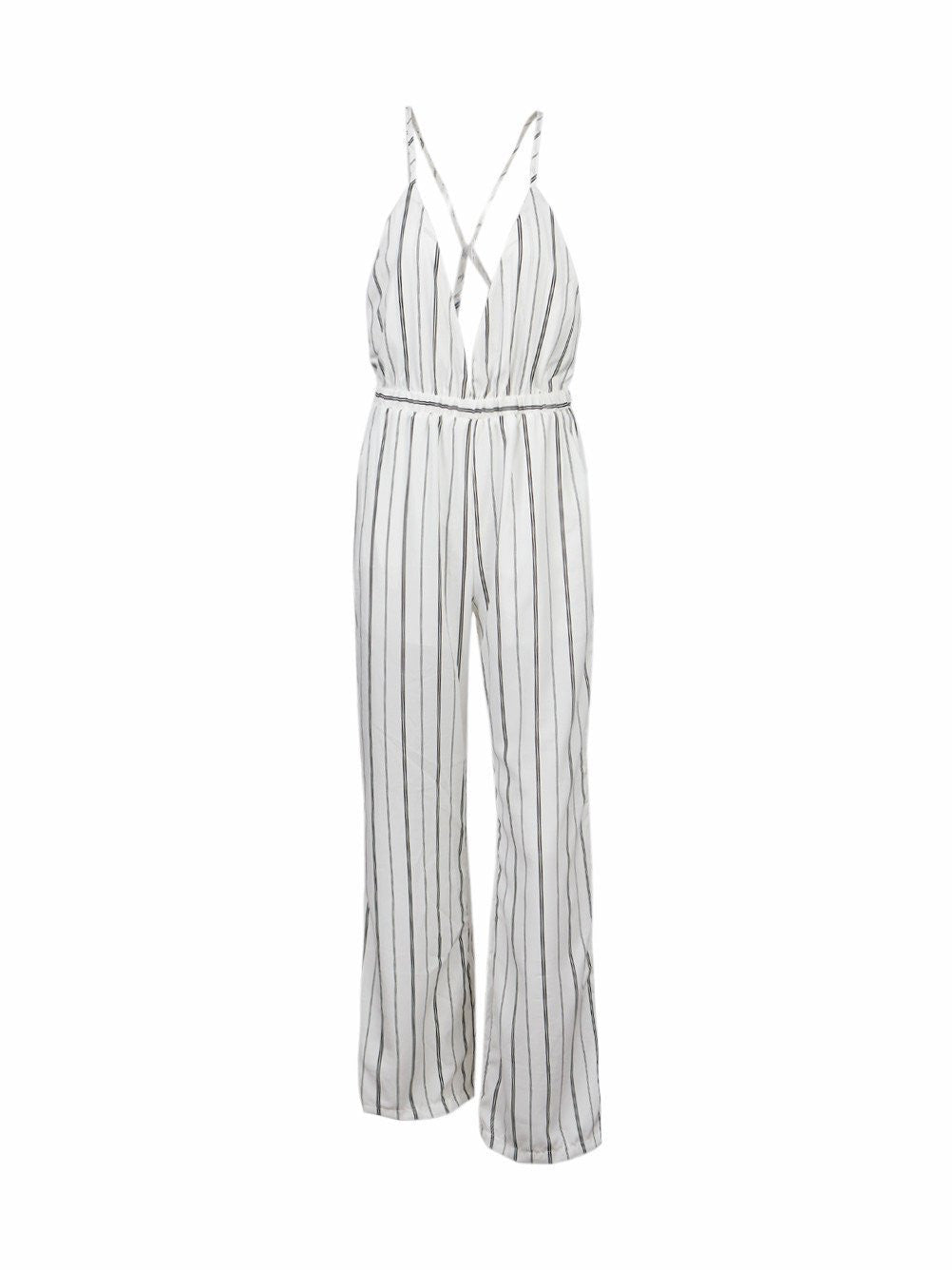 Elevate your wardrobe with the Strap Plunge Deep V Neck Backless Loose Vertical Striped Print White Wide Leg Jumpsuit Romper Casual Palazzo Pants. Get ready to turn heads and feel fabulous wherever you go!