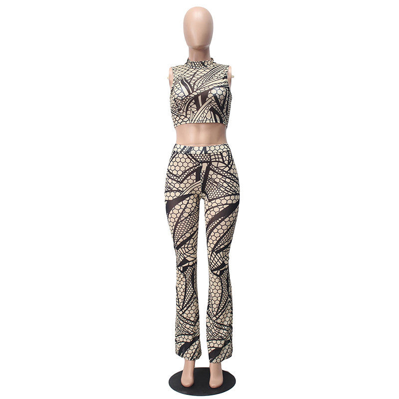 Introducing the Two Piece Geometric Printed Jumpsuit Long Pants Bandage With Crop Top, a must-have ensemble for women who appreciate style and comfort. This stunning outfit features a chic bandage crop top paired with eye-catching geometric printed long pants, making it perfect for any occasion—from casual outings to upscale events. Effortlessly showcase your elegant sense of style with this captivating two-piece that combines sophistication with modern fashion trends.