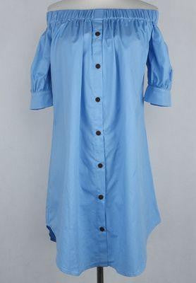 This amazing off-the-shoulder shirt dress is beautiful. This solid Lantern sleeve casual button-down dress. It's cotton and spandex material you are short to get the perfect fit in this suit.