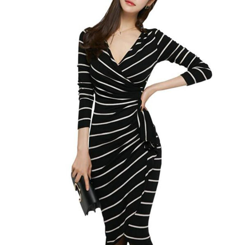 Introducing the Women Dress Fashion Slim OL Stripe V-neck Long Sleeve Elegant Bodycon Dresses WQL3932 – the perfect blend of style, comfort, and sophistication! This stunning dress is designed for the modern woman who desires elegance in her wardrobe. Crafted from a high-quality blend of cotton, polyester, spandex, and laon, this dress ensures a flattering fit that hugs your curves beautifully.