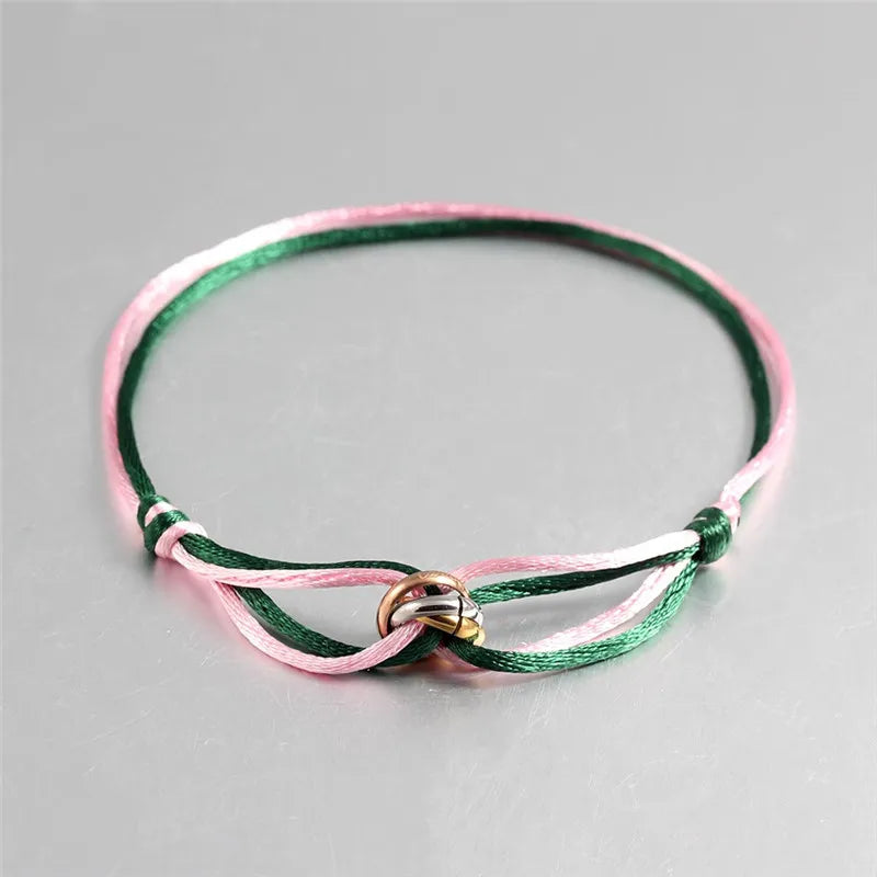 Discover the charm of the Three Ring Interlock Love Friendship Adjustable Rope Braided Bracelet, a beautiful piece designed to embody the essence of love and friendship. This bracelet features a unique braided rope design that not only enhances its aesthetic appeal but also represents the strong connections we share with loved ones. The interlocking rings serve as a powerful symbol of unity, making it a perfect gift for friends, family, or partners.