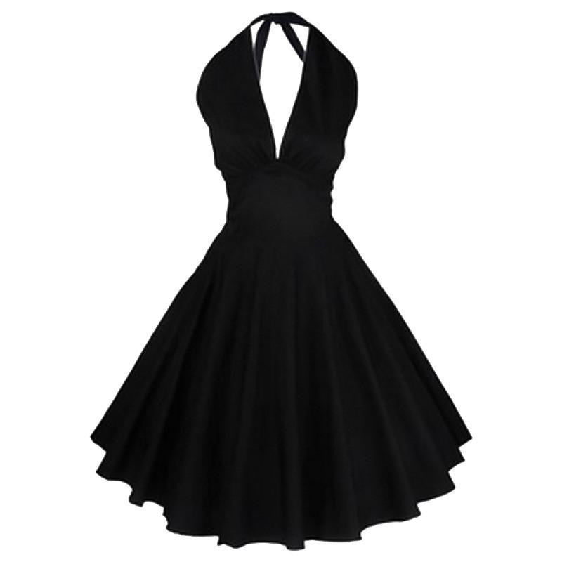 Embrace timeless elegance and make a statement in the Tonval Women Vintage Rockabilly Black Dress Audrey Hepburn 50s V Neck Backless Evening Party Halter Summer Dresses today!