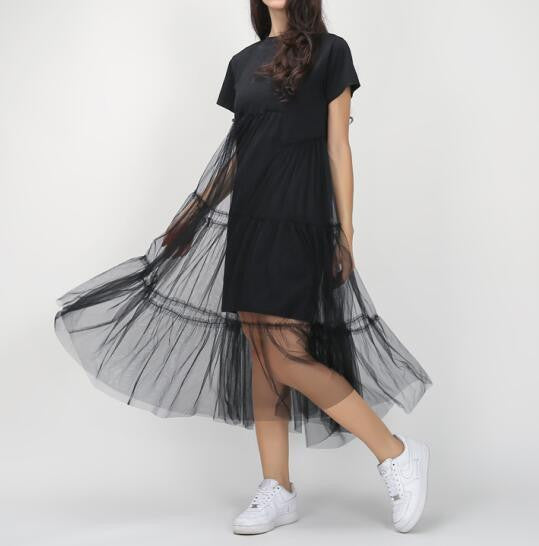 Step into summer with our Summer Korean Plus Size Splicing Pleated Mesh T shirt Dress Women Black Gray Color Clothing Fashion. This stunning dress is crafted from a blend of high-quality cotton and chiffon, providing you with the ultimate comfort and style. The unique splicing design adds a fashionable twist, making it perfect for any outdoor event, from picnics to casual gatherings.