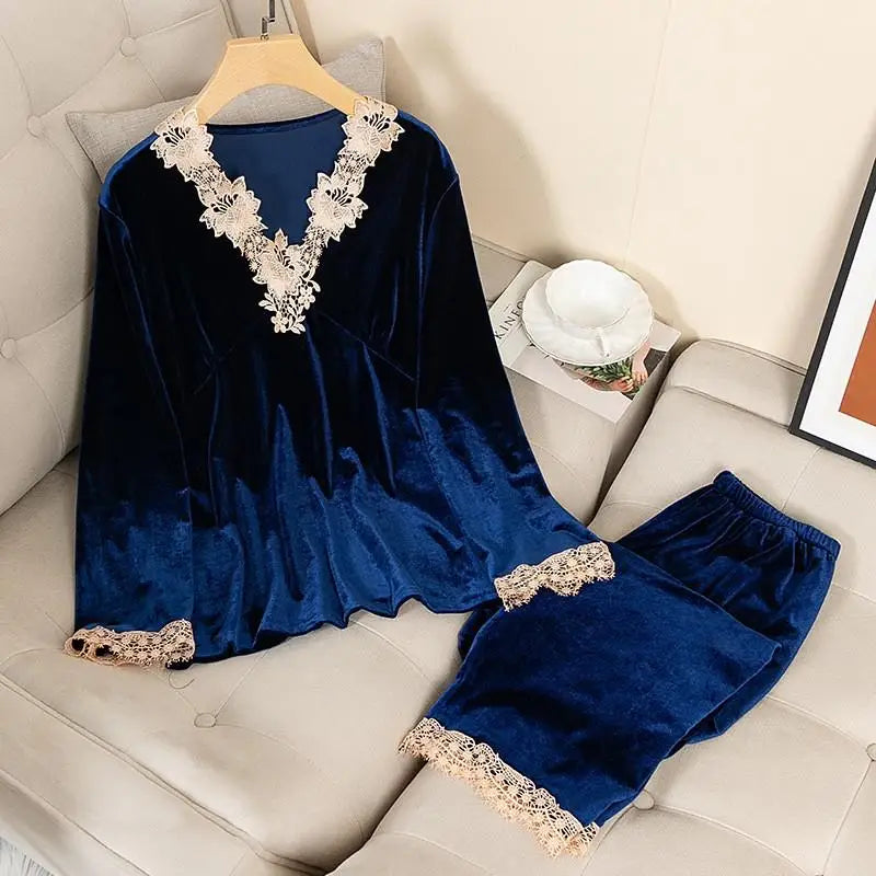 Our Velvet Pyjamas Women Sleepwear Long Sleeve Casual Nightwear Suit Loose Lace Trim Sleep Set is not just about looks; it's about feeling good, too. The soft fabric and relaxed fit make it ideal for lounging around or enjoying a good night's sleep. Whether you're treating yourself or looking for the perfect gift, this pyjama set is sure to impress.