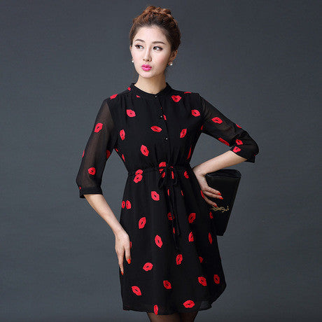 Kiss me all over... this beautiful red lip print dress is the perfect chiffon dress for the Autumn season, with a 3/4 sleeve and an above the knee length this drawstring waist. This dress is perfect