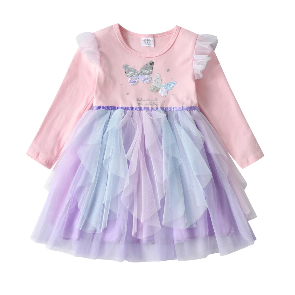 This exquisite Girls Butterfly Sequins Flare Sleeve Dress not only enhances your child's wardrobe but also boosts her confidence with its enchanting design. Make her feel like royalty while offering her the comfort and freedom to play and enjoy her special day. Perfect for pairing with cute accessories and stylish shoes, this dress is a must-have for any fashionable young girl's collection.