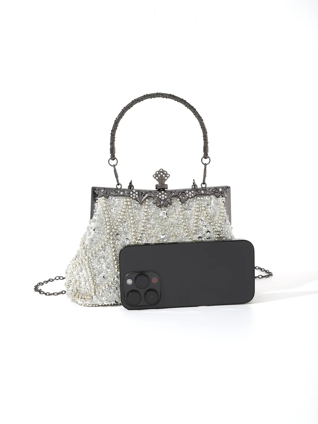Elevate your evening attire with our vintage Heavy industry embroidery flower beaded hand-held evening bag for party. This exquisite clutch showcases intricate floral embroidery, beautifully adorned with shimmering beads and sparkling diamonds that reflect elegance and charm. Perfect for any party or formal occasion, this bag is a statement piece that complements your outfit and adds a touch of sophistication.