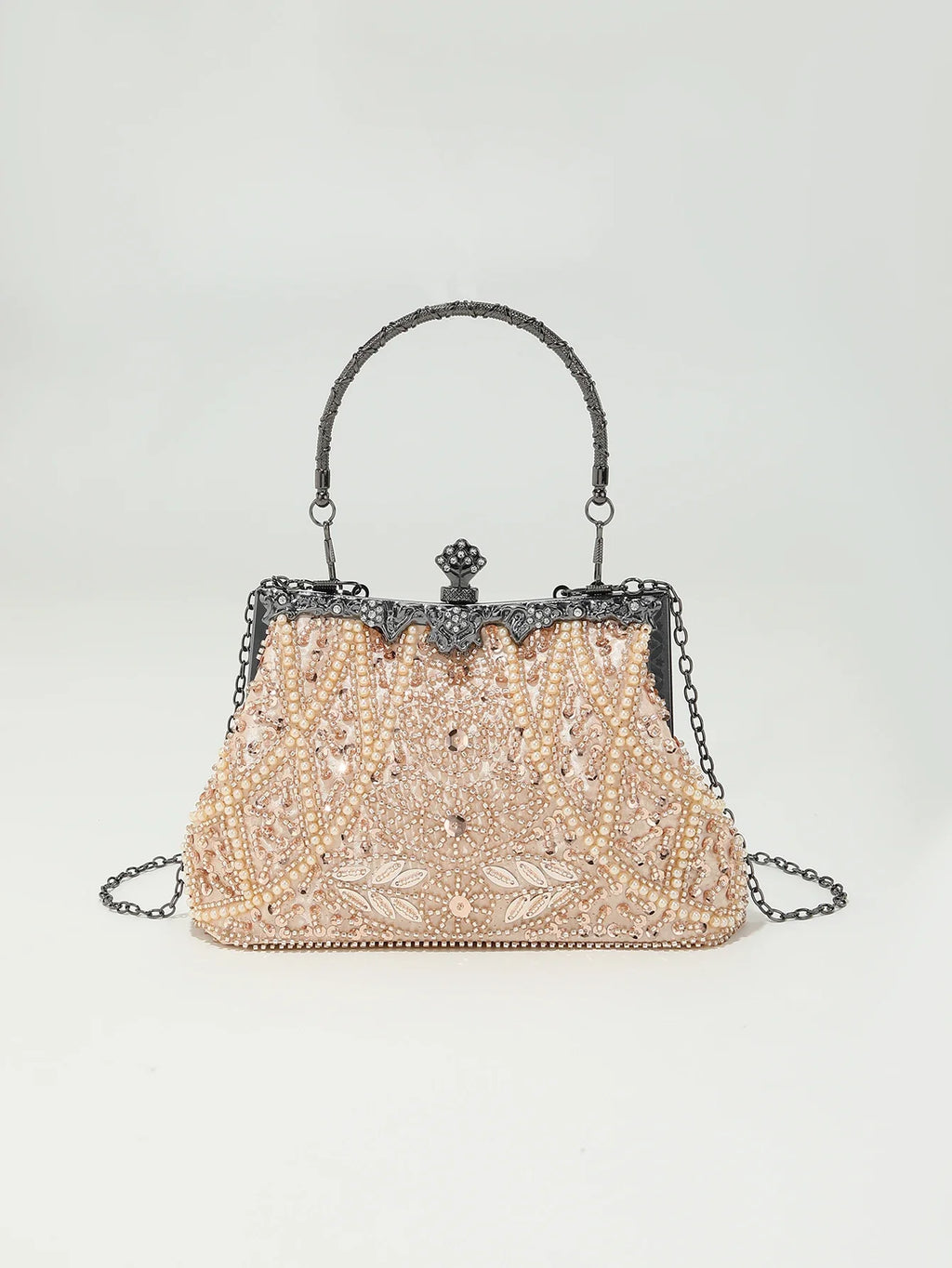 Crafted with a unique blend of vintage aesthetics and modern flair, this evening bag features: