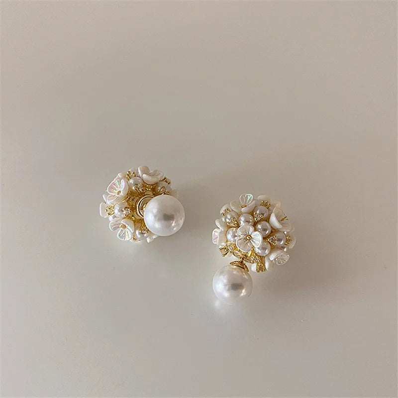 Upgrade your accessory collection with these White Shell Flower Pearl Stud Earrings For Women Ball Double Side Elegant Earrings set Exquisite Vintage Fashion Jewelry and shine with elegance and style!