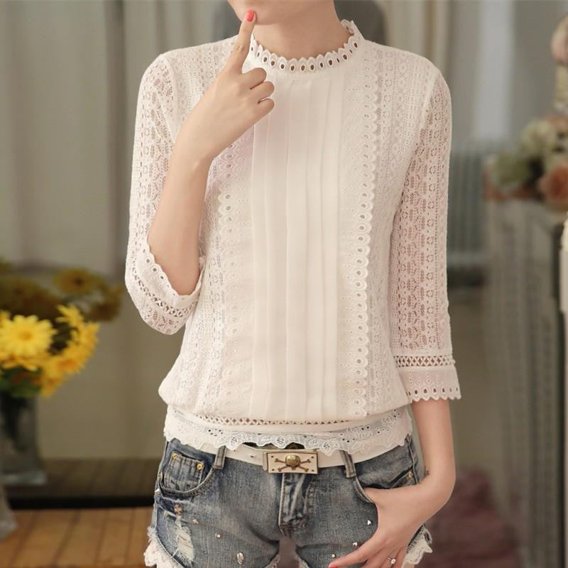 Elevate your wardrobe with the women casual white lace blouse fashion sexy 3/4 sleeve stand collar crochet tops shirt clothes A633. This exquisite blouse is the perfect blend of style and comfort, designed to make you feel confident and chic no matter the occasion. Crafted from a soft and breathable fabric mix of cotton, polyester, and spandex, it ensures all-day comfort while keeping you on-trend.
