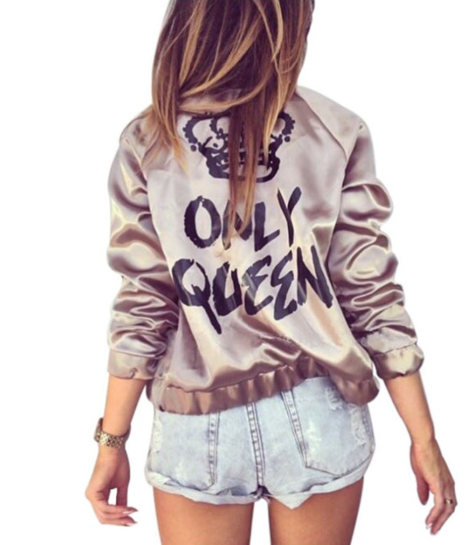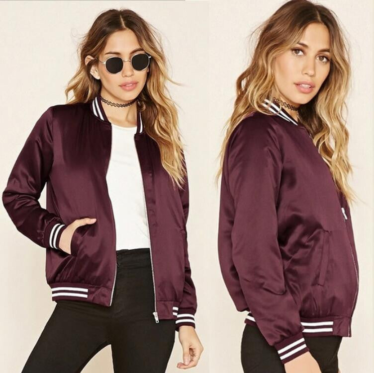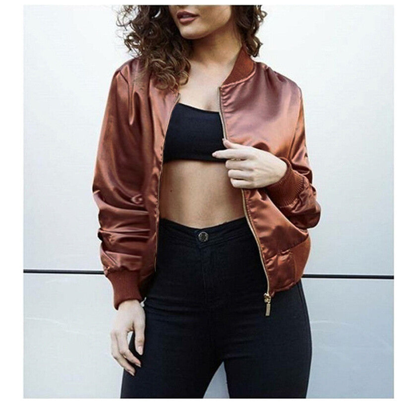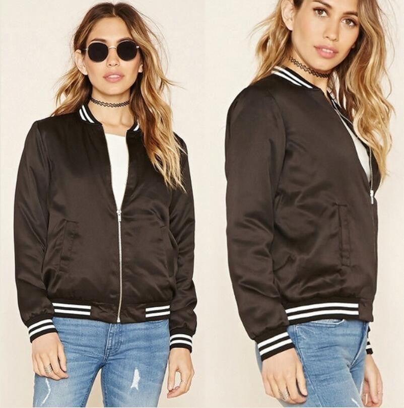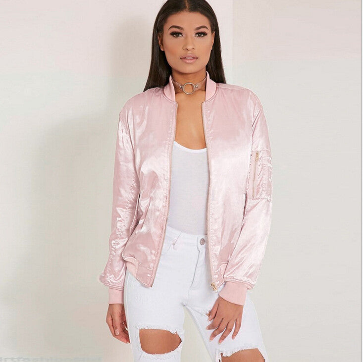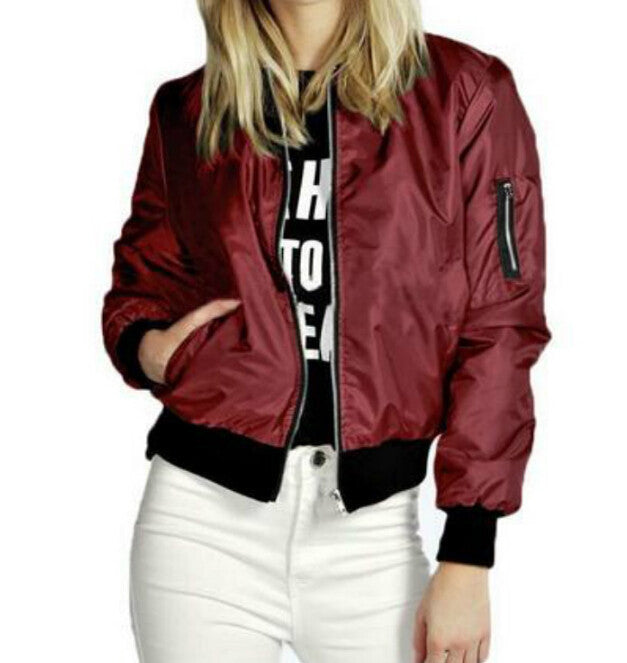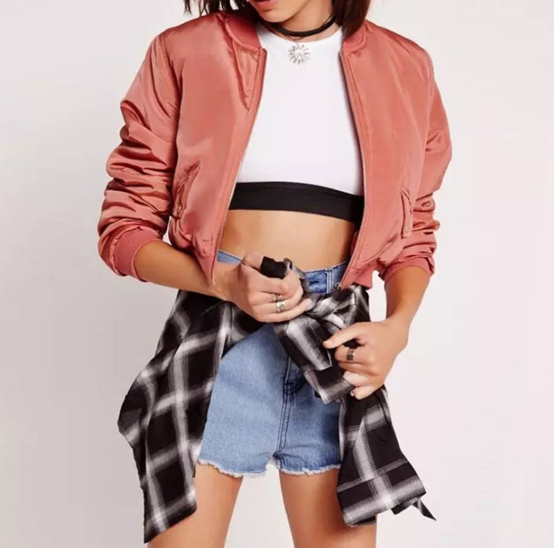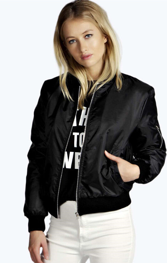 Fashionable women bomber jacket with long sleeves. An important outfit for casual outings.