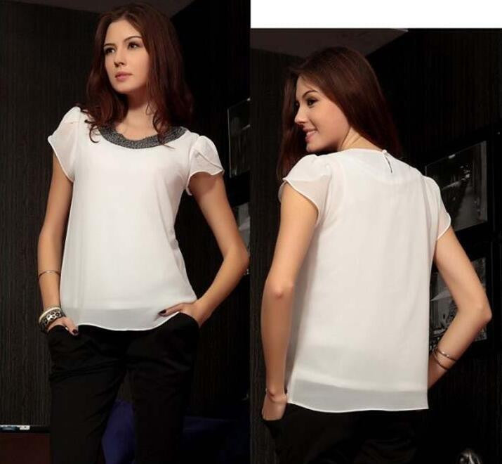 The beaded neckline chiffon top is attractive. The elegant short sleeve blouse is a designer's piece. Created to contour your sexy curves and define your fashion taste. Look stunning.