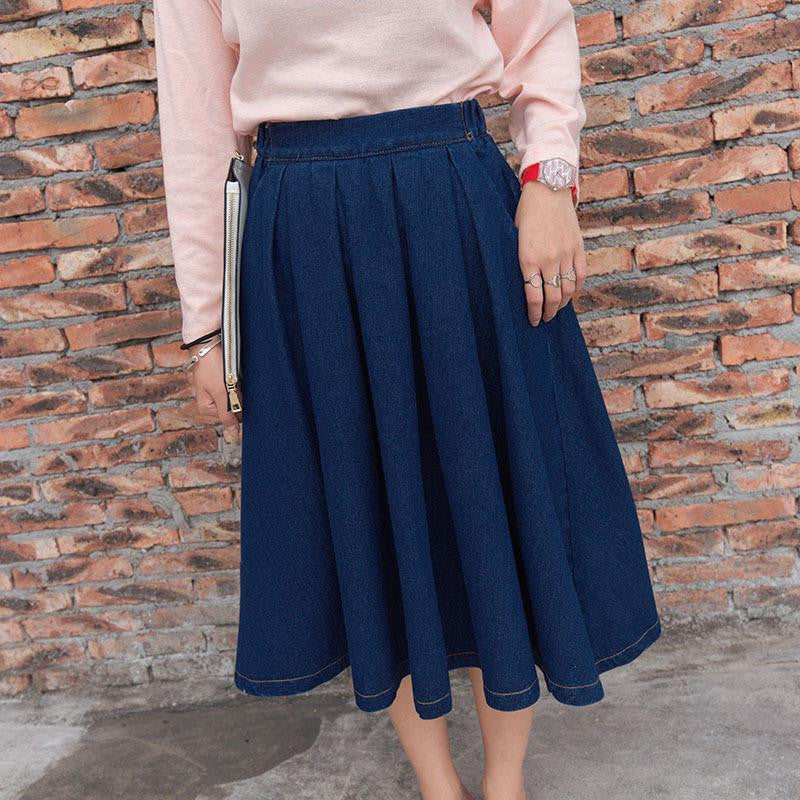 The pleated women denim skirt is a summer's favorite. This durable skirt is fashionable. Get it into your summer line up today.