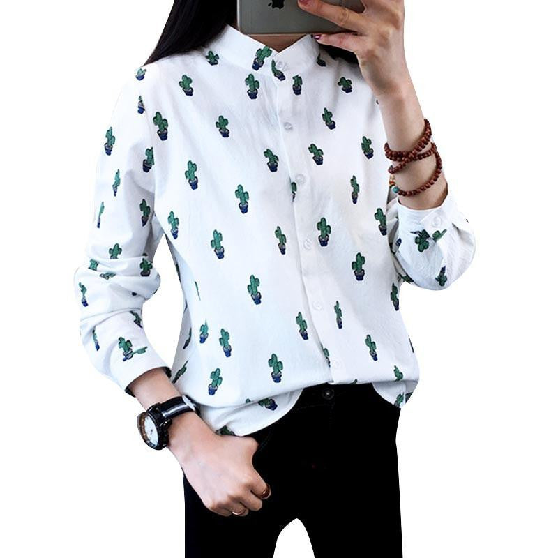 Introducing our Women Fashion Blouses Long Sleeved Sweet Cute Shirts Cactus Printed Stand Collar Casual Leisure Tops Plus Size, a delightful addition to your wardrobe. This charming top combines comfort and style, making it perfect for casual outings or relaxed days at home. Featuring a unique cactus print, it effortlessly stands out while ensuring you look chic and trendy.