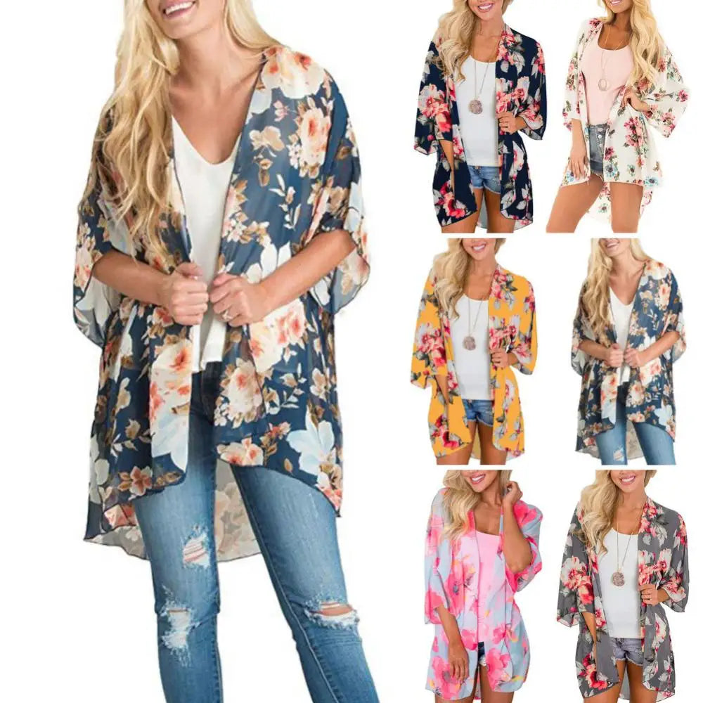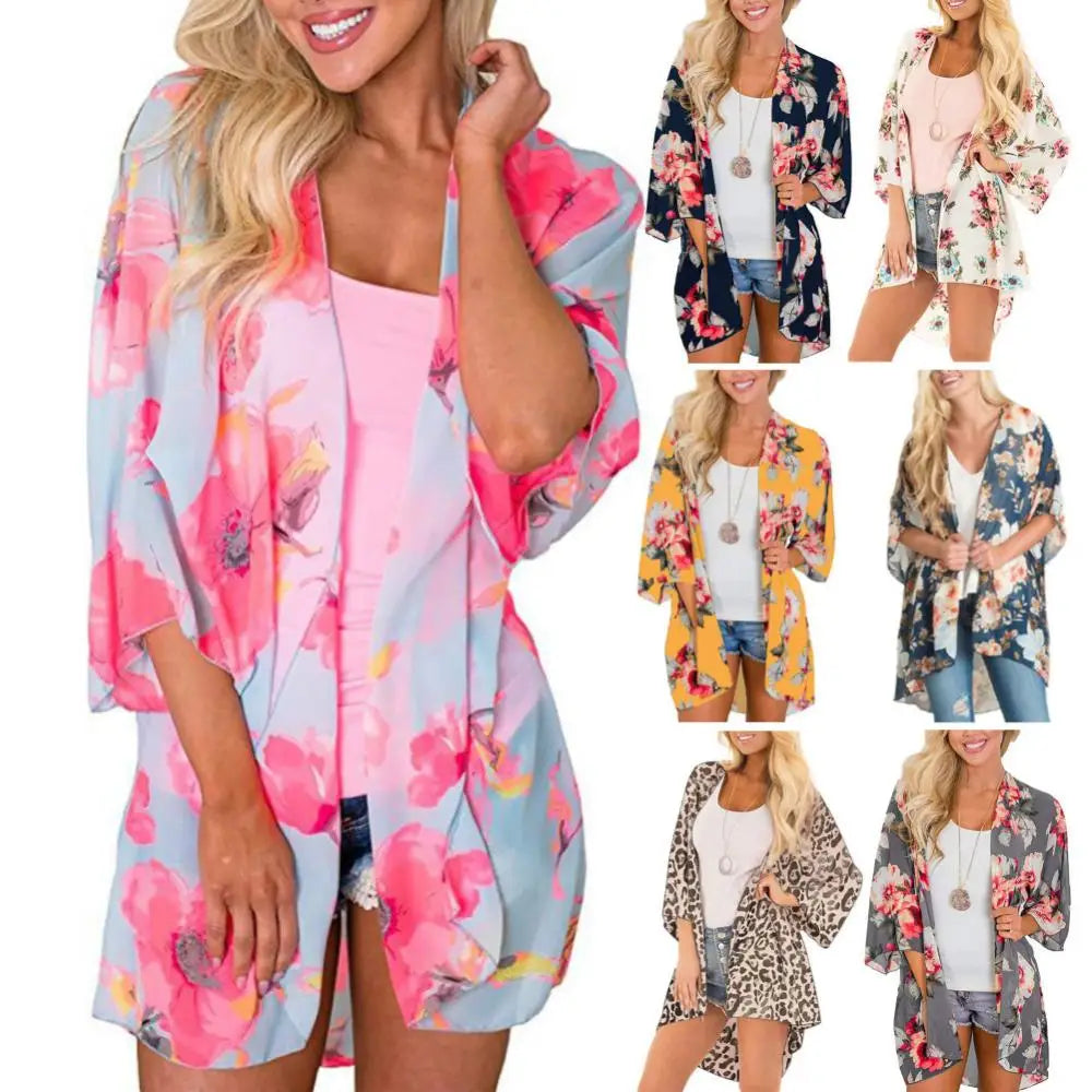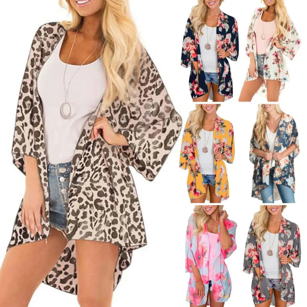 Make a statement this summer with the Women Floral Leopard Print Half Sleeve Shawl Chiffon Kimono Beach Cardigan Bikini Cover Up Wrap Beachwear Outdoor Anti-UV Coat. Perfect for beach outings or pool parties, this kimono is your go-to accessory for effortless style and sun protection!