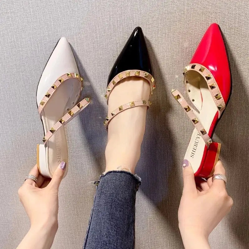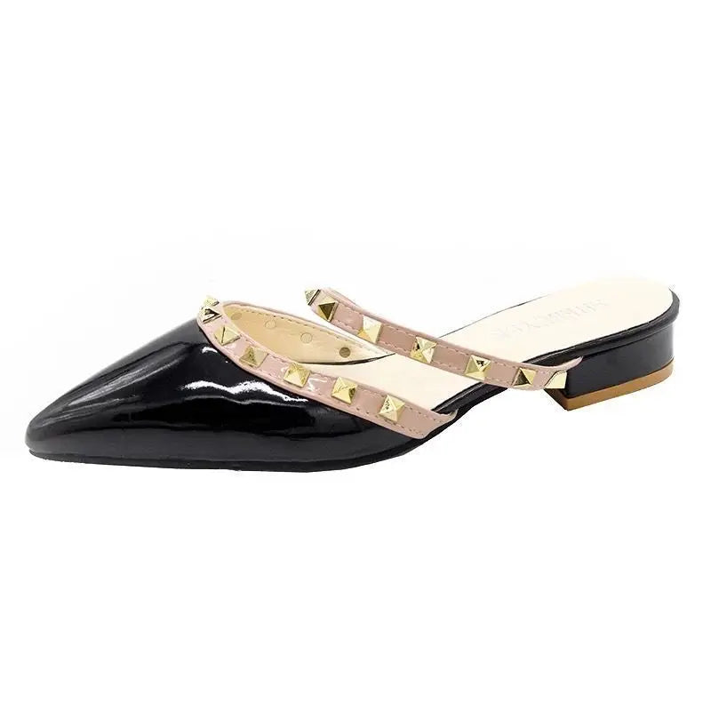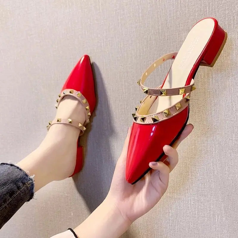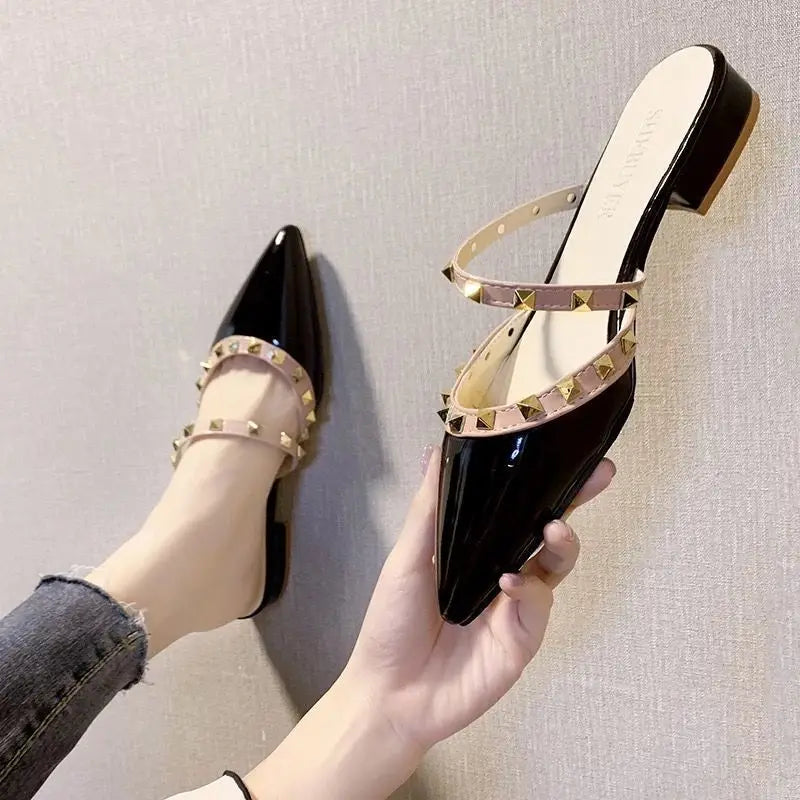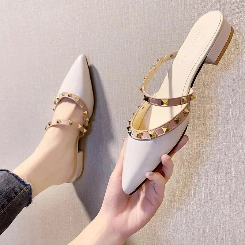 Step into style with our Women High Heels Slides Sandals! These slides feature a unique pointed toe design with trendy rivets, adding a touch of flair to your outfit. The thick heel provides both fashion and comfort, making these the perfect choice for any occasion. Elevate your shoe game with these must-have slides.