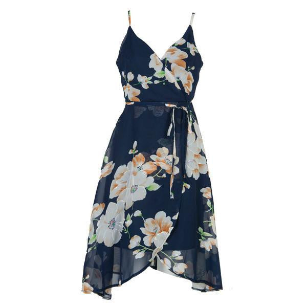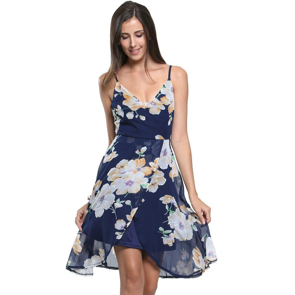 Whether you're heading to the beach, attending a summer wedding, or enjoying a casual day out, this dress is the perfect addition to your summer wardrobe. Embrace the summer vibes with our Women Navy Floral Print V Neck Wrap Front Cross Backless Asymmetric Dress Summer Fashion A Line Chiffon Beach Dresses today!