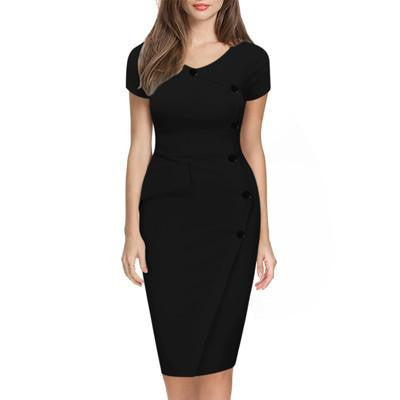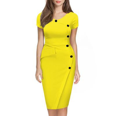 Introducing the Women Summer Short Sleeve Button Cotton Blend Empire Casual Stretch Bodycon Knee-Length Pencil Dress, an essential addition to your summer wardrobe. Crafted from a high-quality cotton blend, this dress offers both comfort and style, perfect for any occasion. Whether you're headed to a casual brunch or an evening event, this versatile piece ensures you look effortlessly chic.