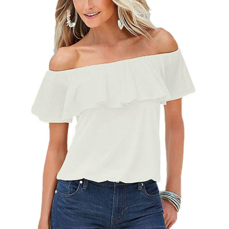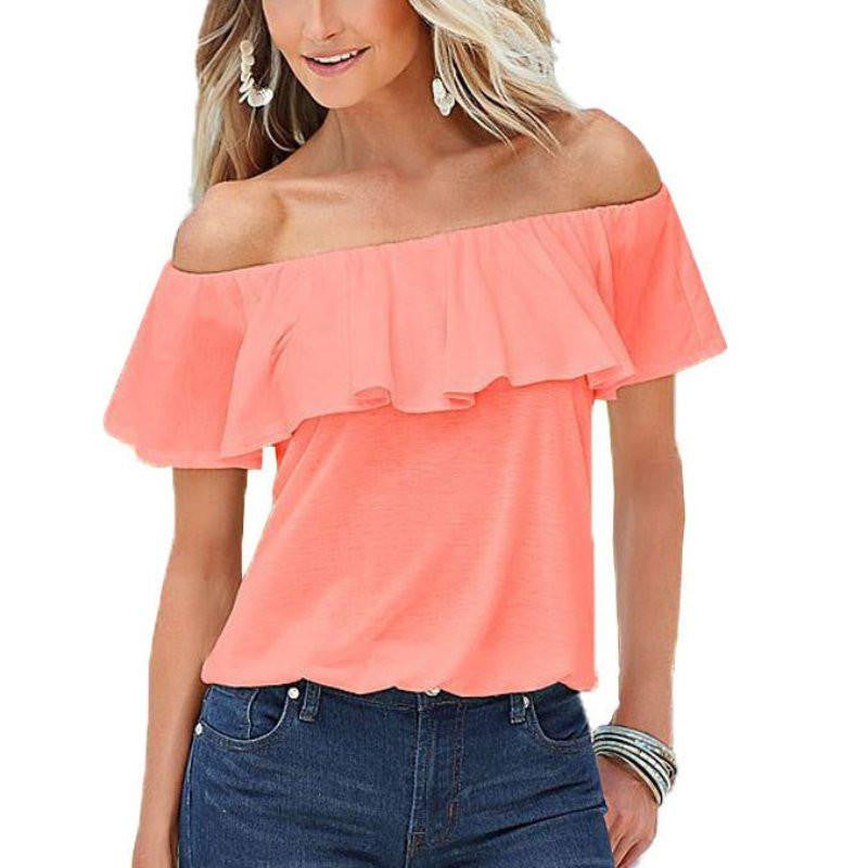 Enhance your wardrobe with the Women sexy Cropped Shirt Slash Neck Ruffle Short Sleeve Off Shoulder Top Blouse and turn heads wherever you go!